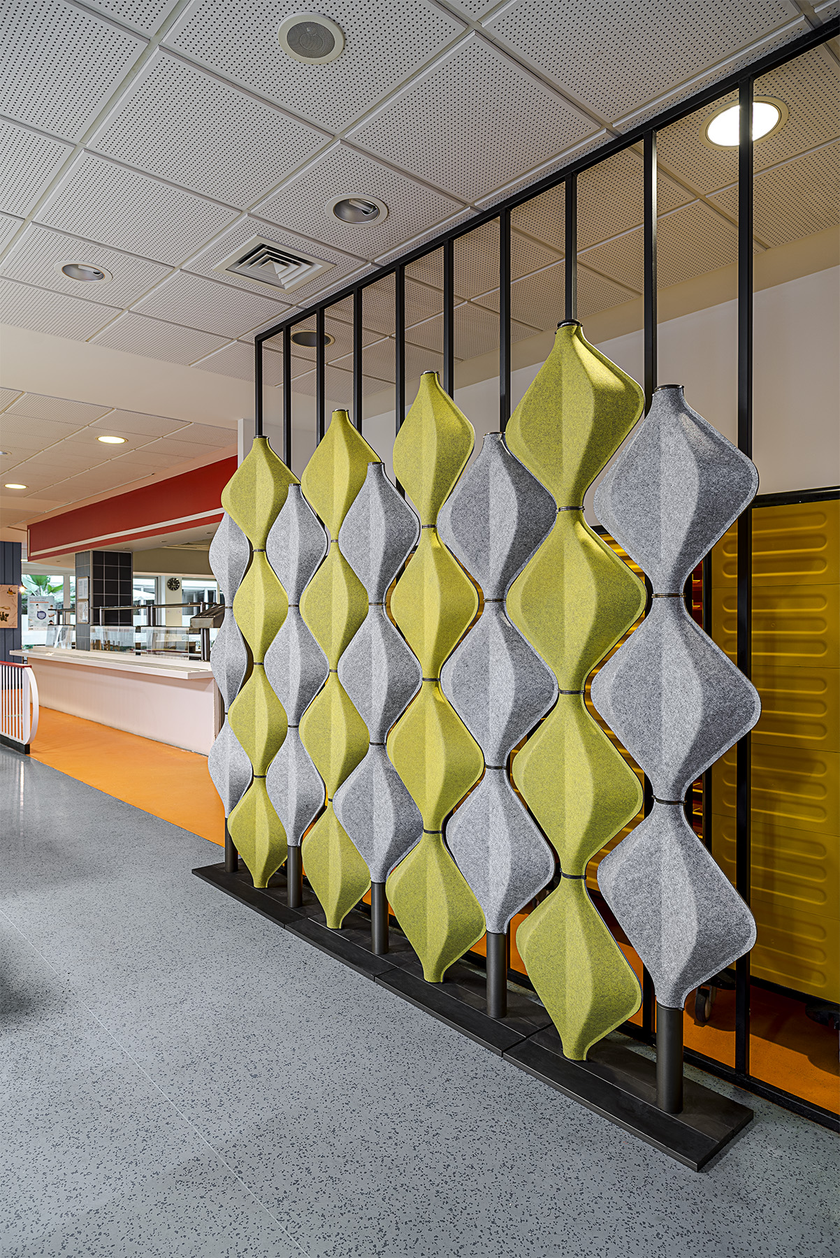 Diagon Akustik Panel, yenilikçi formu ve yüksek ses emiciliğiyle ortam akustiğini iyileştirirken, mekâna modern bir bölme ve tasarım öğesi kazandırır.